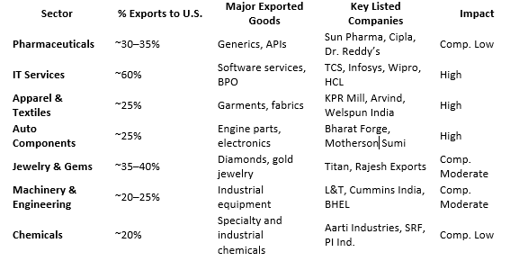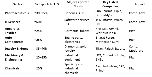 Auto Ancillaries (Motherson Sumi, Bharat Forge): U.S. clients may reduce sourcing due to cost inflation.