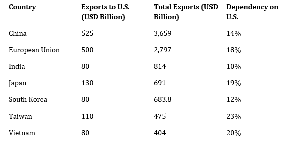 As evident, the export dependency of some countries on specific states is significant and cannot be overlooked—accounting for approximately 20% of their total exports in some cases. The United States, being the world’s largest importer with imports valued at around USD 3,170 billion, is a critical trade partner for many of these nations.